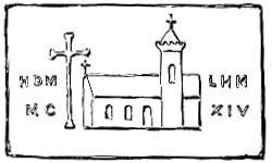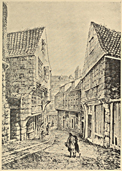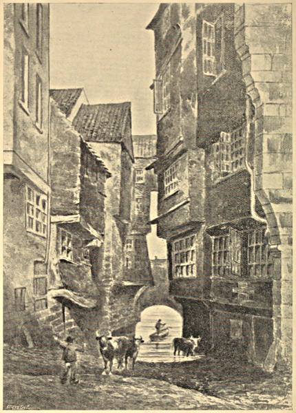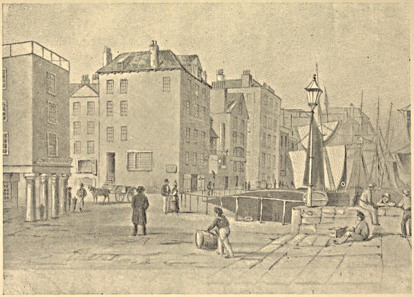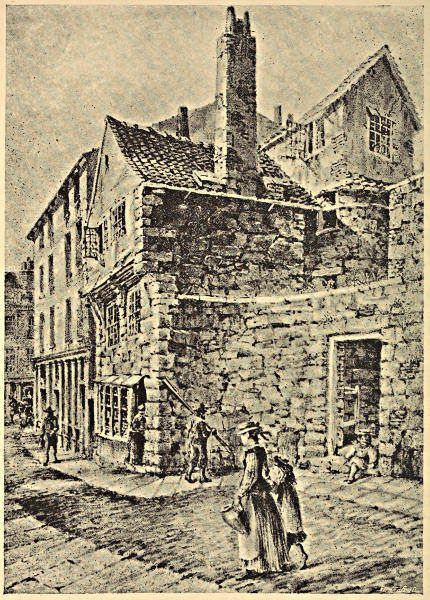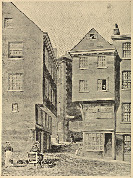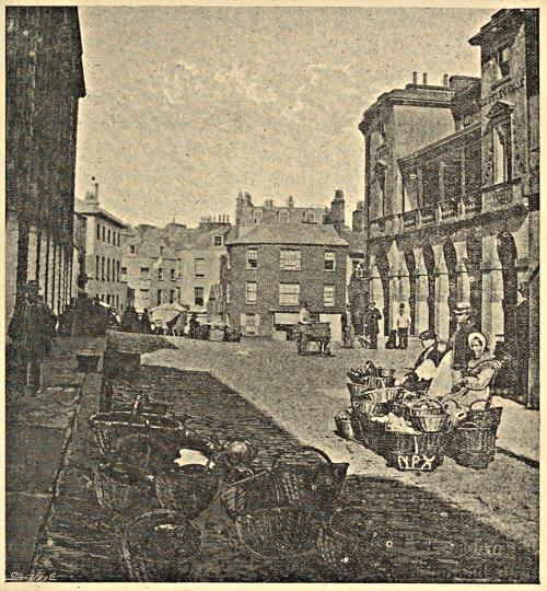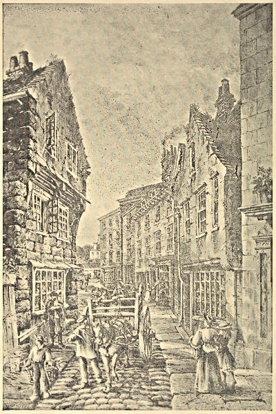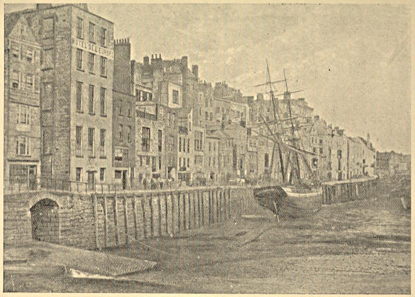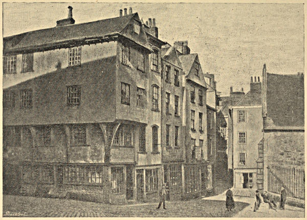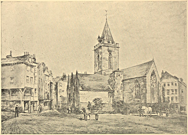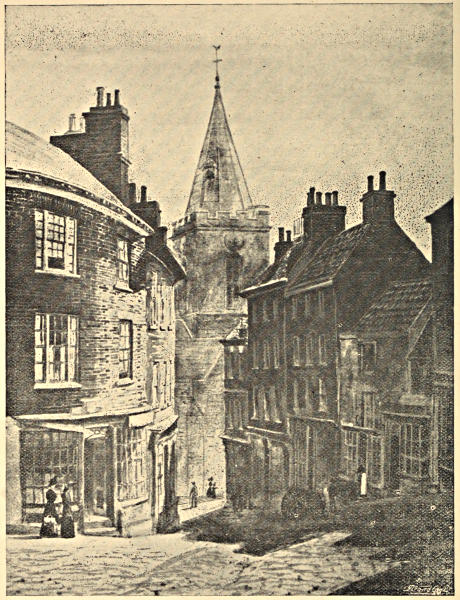 Parish Church of St. Peter Port, shewing houses now demolished. From sketch by P. Le Lièvre, now in possession of Mr. Grigg. W. Guerin. 70